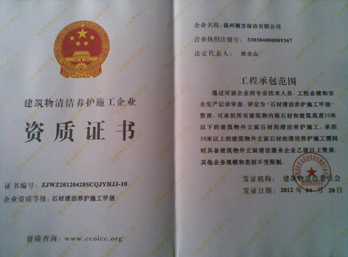 石材養(yǎng)護(hù)施工資質(zhì)證書